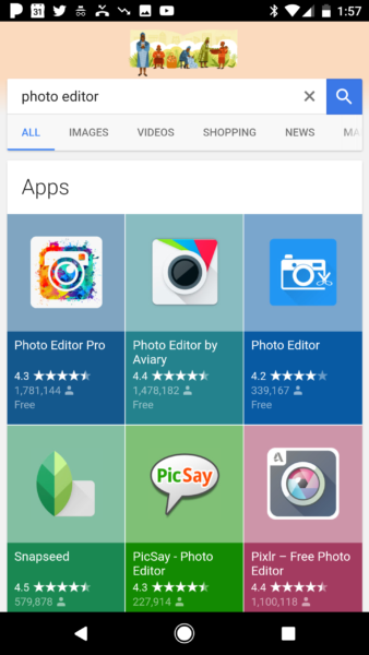 As a result, Google now includes an “app pack” at the top of the mobile search results. You can see it if you open up the browser on your mobile device and search for something like “photo editor.”