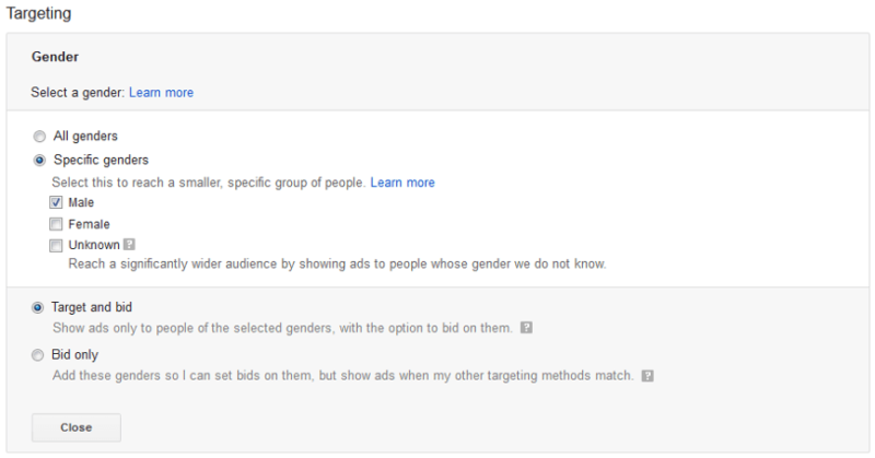 In the early goings of Google’s testing for age and gender targeting, advertisers had the option to select “Target and bid,” as well as “Bid only,” as shown by the screen shot below taken in early 2015.